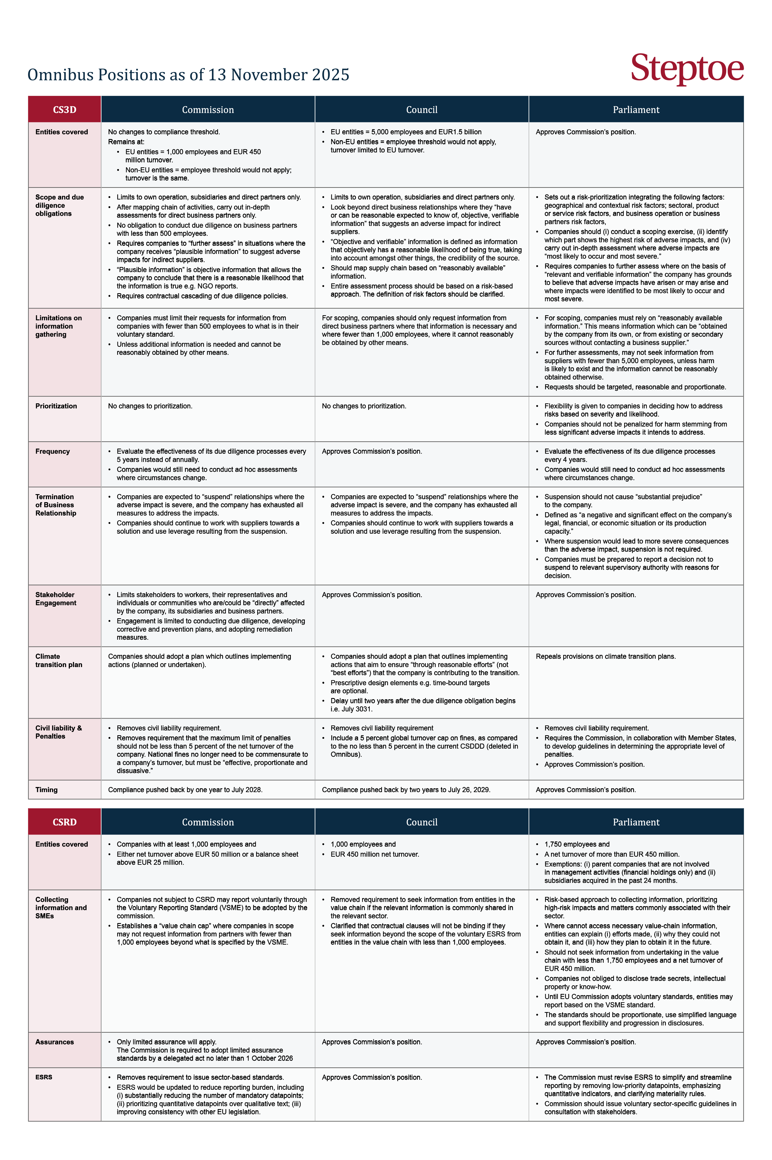 The Council published its General Approach to the Omnibus in June 2025, but Parliament has struggled to reach a consensus on its draft. The center-right parties pushed for higher thresholds and a more risk-based approach, while the Socialist & Democrats and Greens/EFA resisted what they saw as a dilution of the original directive's ambition. On 13 November 2025, Parliament adopted its much-anticipated negotiating position on the Omnibus, including the following key amendments to the Commission's proposed draft (we include a detailed table with the three positions as they stand at the end of this post):