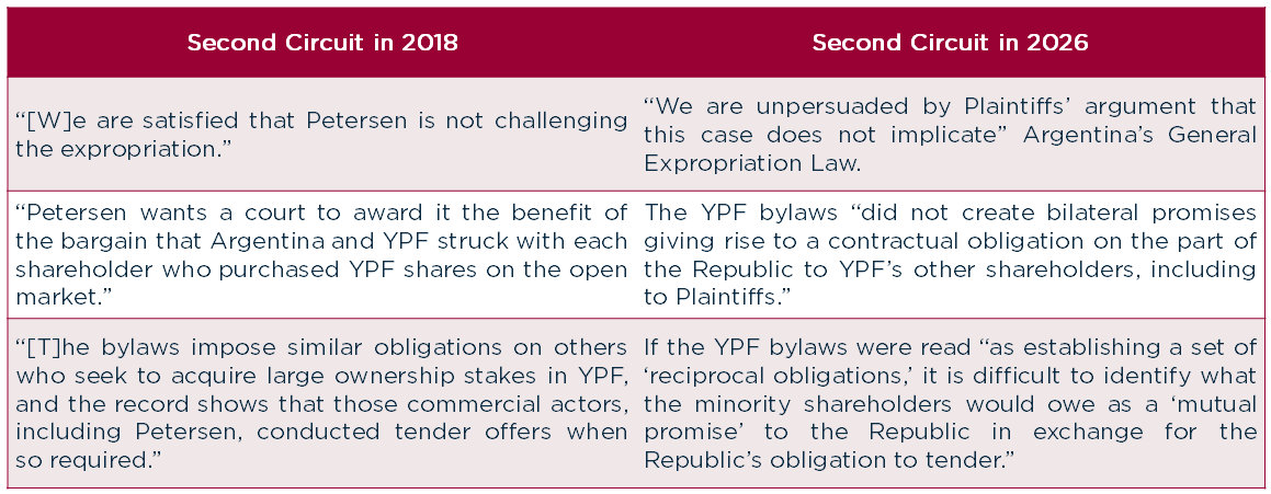That tension is particularly notable given that both decisions were authored by Judge Denny Chin, who took a relatively quiet role during oral argument in 2025. Since the text of the relevant documents did not change between 2018 and 2026, the principal intervening development was the entry of a $16.1 billion judgment in 2023, a point Judge Chin highlights in the opening sentence of the opinion by noting that the award "equals approximately 45% of the Republic's entire national fiscal" budget.