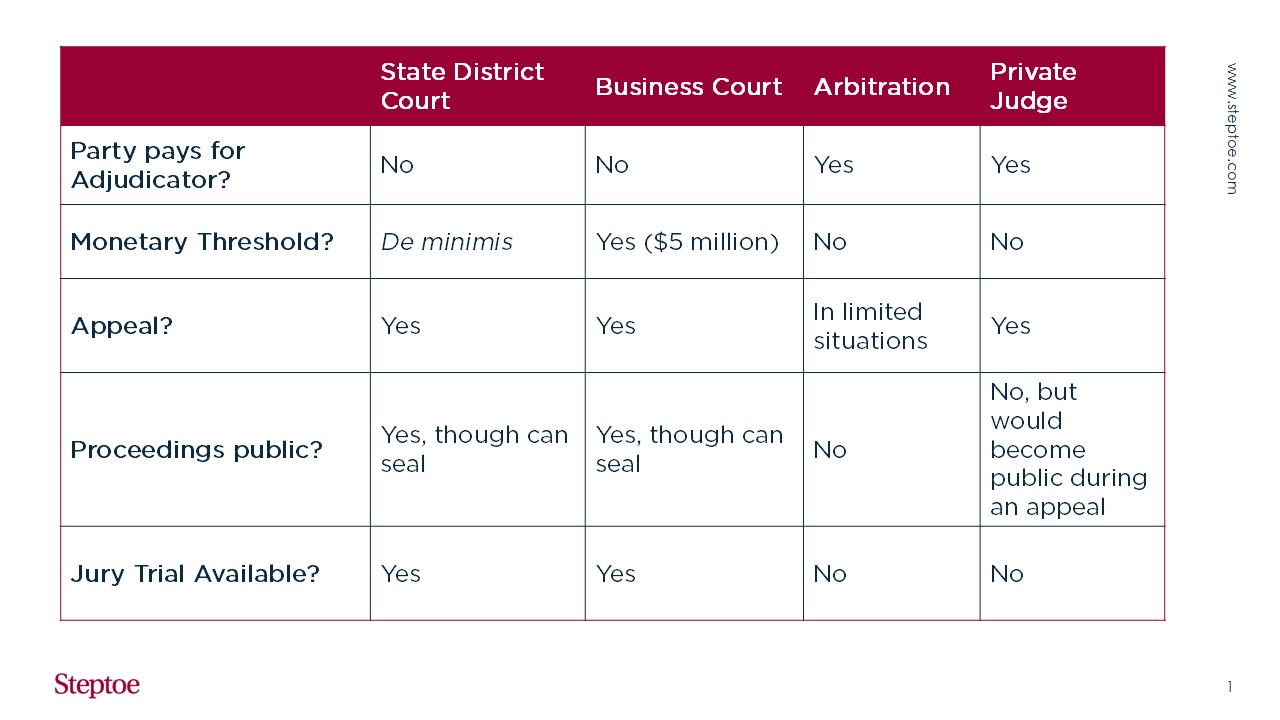 One example where a private judge may be especially well suited is for companies engaging in operations or business deals in Mexico. After Mexico implemented its controversial judicial reform in 2024,11 many companies began choosing to bypass the Mexican court system by entering into contracts that require arbitration in Houston. Private judges could be a useful alternative for those companies that prefer a litigation-style approach instead of arbitration but want more certainty and control than the Texas courts may be able to offer litigants or cannot meet the Business Court’s jurisdictional threshold of $5 million in controversy. Steptoe has consulted with many companies on crafting dispute resolution provisions that best address the business's needs and concerns, whether that means litigating in the courts, via arbitration, or via private judges.